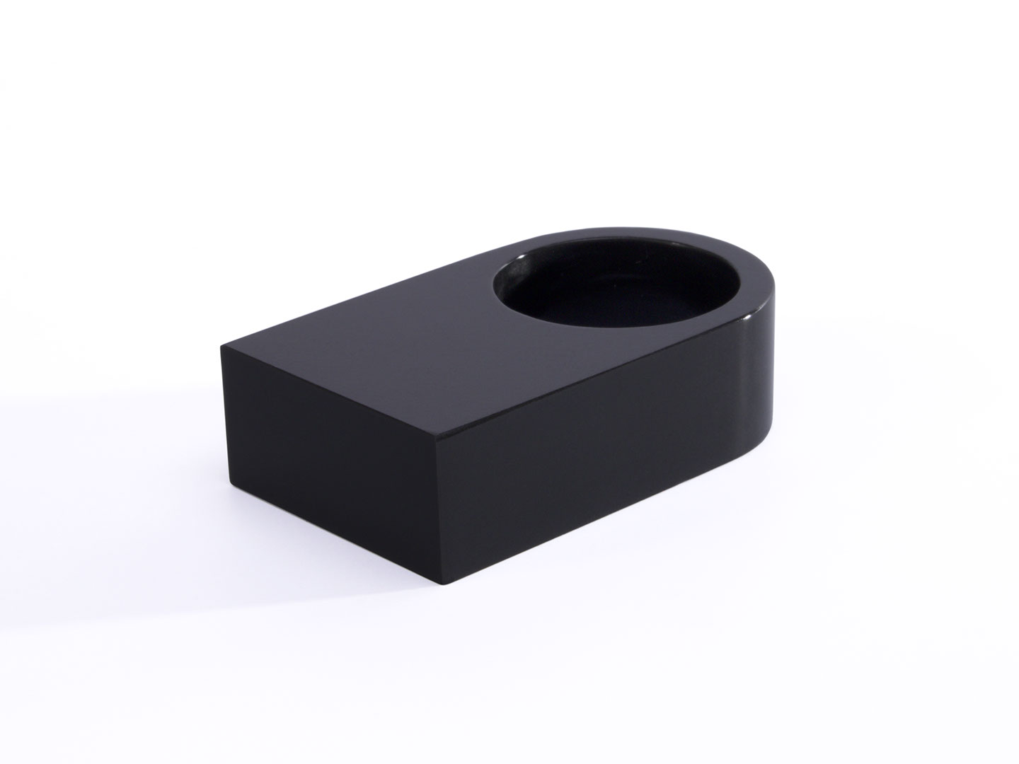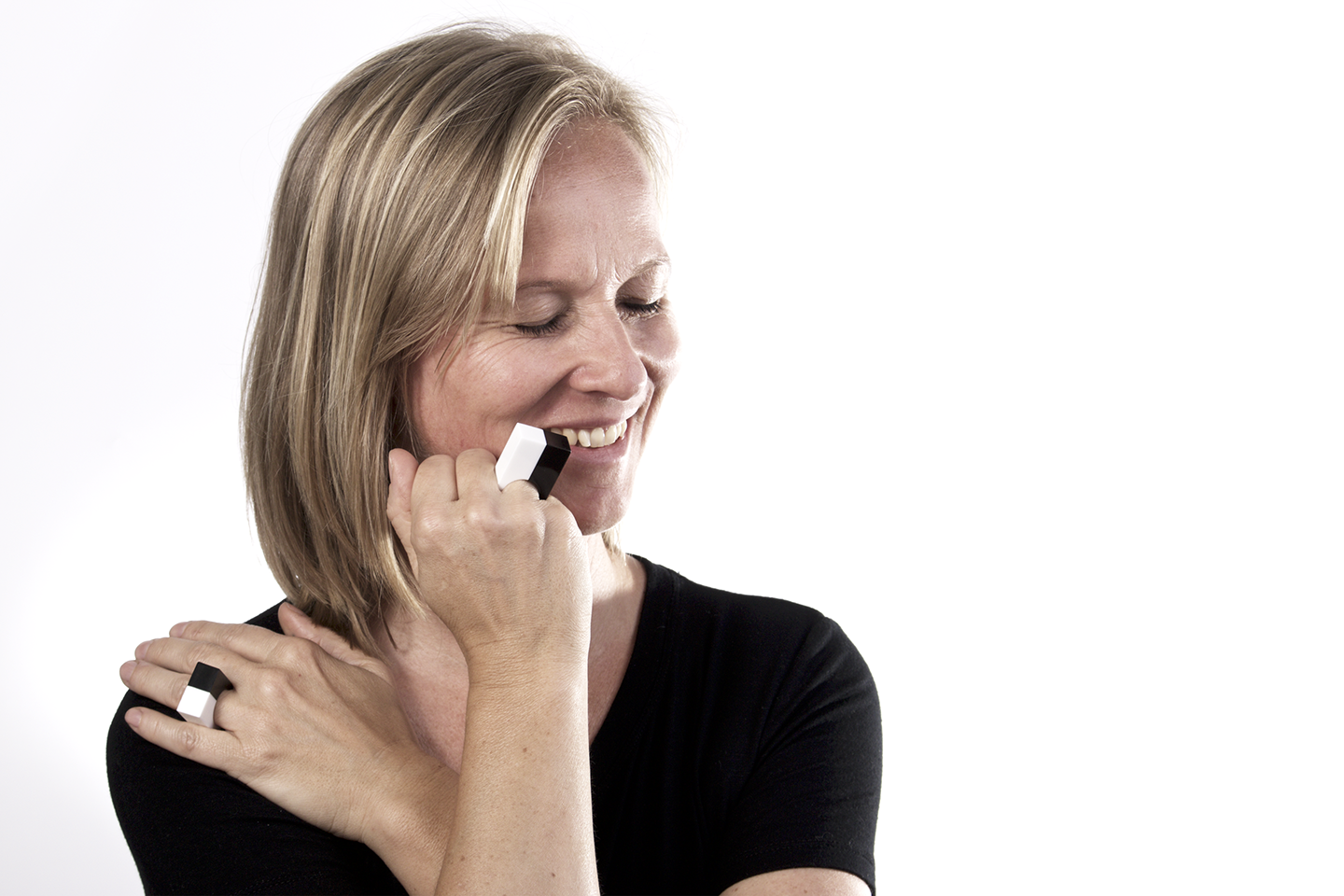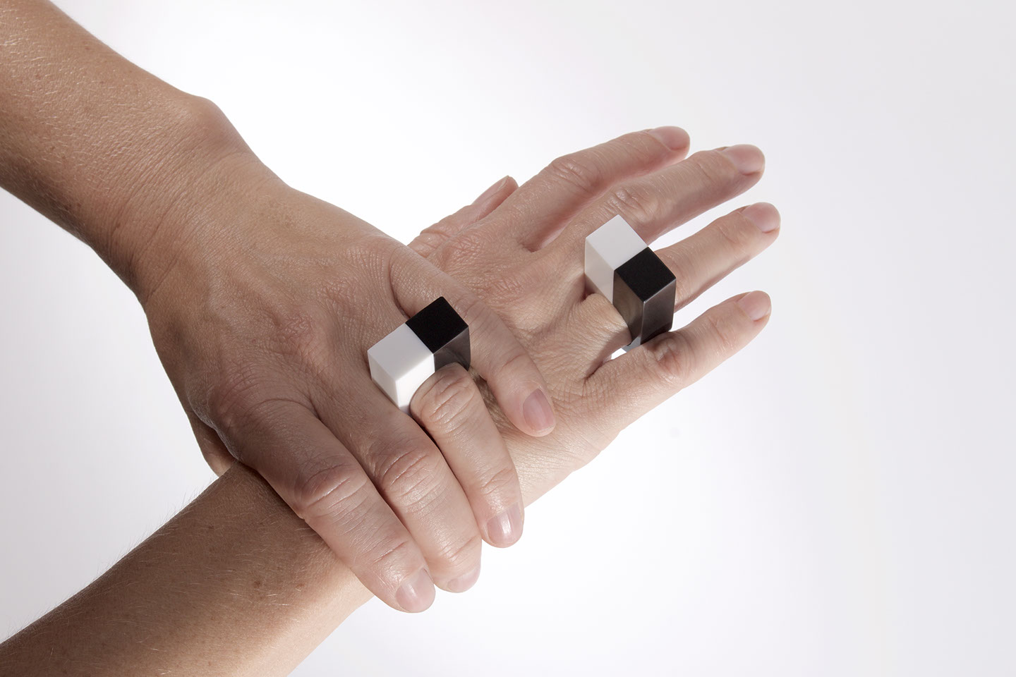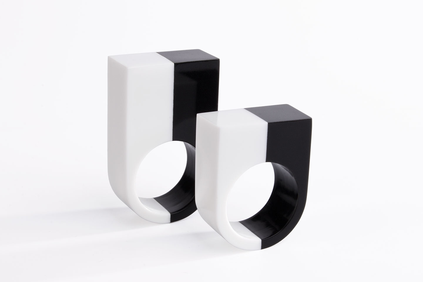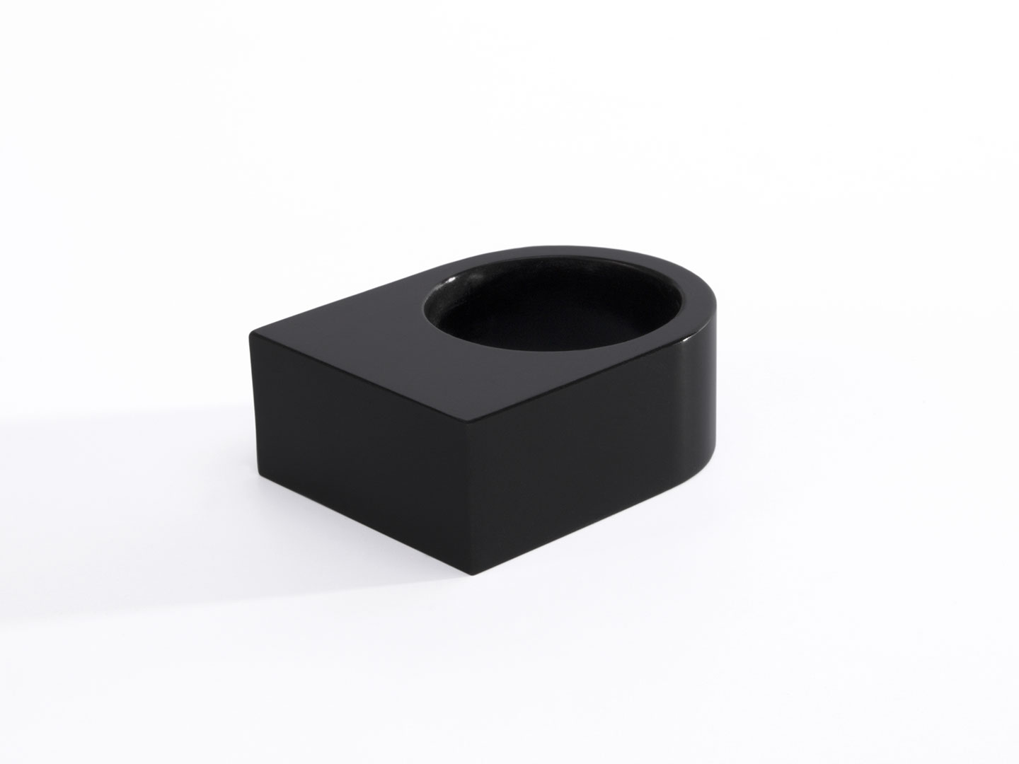 The shape of the Ringcollection is a geometric form with sharp edges and a smooth textured surface. It’s a jewelry sculpture developed from one piece of natural mineral and high performance acrylic : a monolith. First cutting the monolithrings with a CNC machine from a big sheet , then the final step is polishing every single ring by hand.